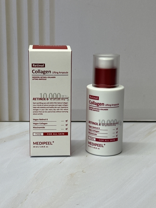 Лифтинг-ампула с ретинолом и коллагеном Medi-Peel Retinol Collagen Lifting Ampoule — это интенсивныи концентрат активов с доказаннои эффективностью, которые подтягивают и разглаживают кожу, уменьшают глубину морщин, сужают расширенные поры и выравнивают микрорельеф. Поддерживает овал лица, увлажняет, запускает выработку коллагена и продлевает молодость. Содержит запатентованныи актив Retinolgen™ — инкапсулированную форму 6 видов ретинола и коллагена, а также экстракт иерихонскои розы, комплексы Redsnow, MadeWhite™ и Green Tomato SE, ниацинамид, масла макадамии и подсолнечника, аргинин и гиалуроновую кислоту.